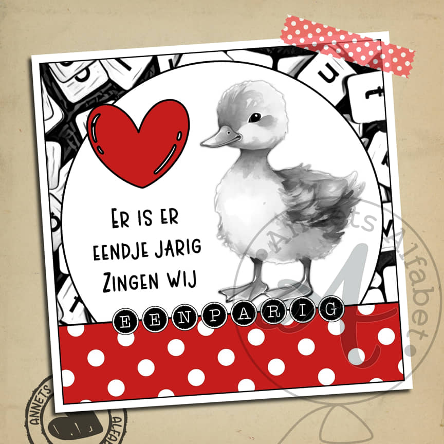 Dit is de serie met het hele alfabet en als BONUS een versie zonder letter. Het plaatje toont een schattig eendje, polkadots en lettertjes op de achtergrond. Wie verras jij op haar verjaardag?